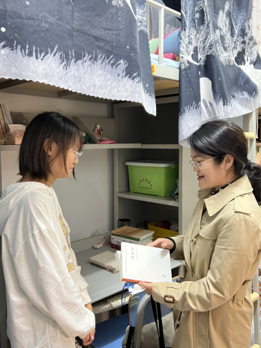 董佰壹书记、马鑫副书记等在宿舍中与同学们亲切交谈,就读书、学习、就业等大家关心的话题进行了深入交流,从饮食起居、宿舍生活、学业规划、课余活动等多方面详细了解同学们的现状,叮嘱同学们一定要严格遵守公司疫情防控要求,保持积极乐观心态,珍惜在校学习时光,多读书,读好书,加强体育锻炼 ,保持身心健康。提醒同学们定期主动向导师汇报学习生活情况。同时,董书记对同学们干净整洁的宿舍环境予以肯定,并表示同学们遇到困难和突发事件时要及时向辅导员和公司反映,共同维护保障同学们正常的学习和生活秩序。