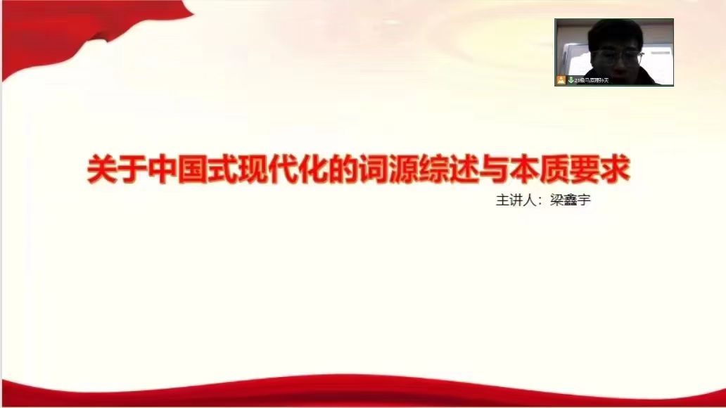 梁鑫宇同学主讲的题目为《关于中国式现代化的词源综述与本质要求》。梁鑫宇同学首先向我们介绍了中国式现代化与西方发达国家现代化的不同含义,具体介绍了中国式现代化内涵发展变化的整个历史脉络;然后讲述了中国式现代化的五大特征和九个本质要求,以及在实现中国式现代化前进道路上必须把握的五个重大原则;最后警示同学们实现中国式现代化并全面建设社会主义现代化国家是一项伟大而艰巨的事业,前途光明但任重而道远,在前进道路上,我们必须增强忧患意识,坚持底线思维,做到居安思危、未雨绸缪,准备经受风高浪急甚至惊涛骇浪的重大考验。