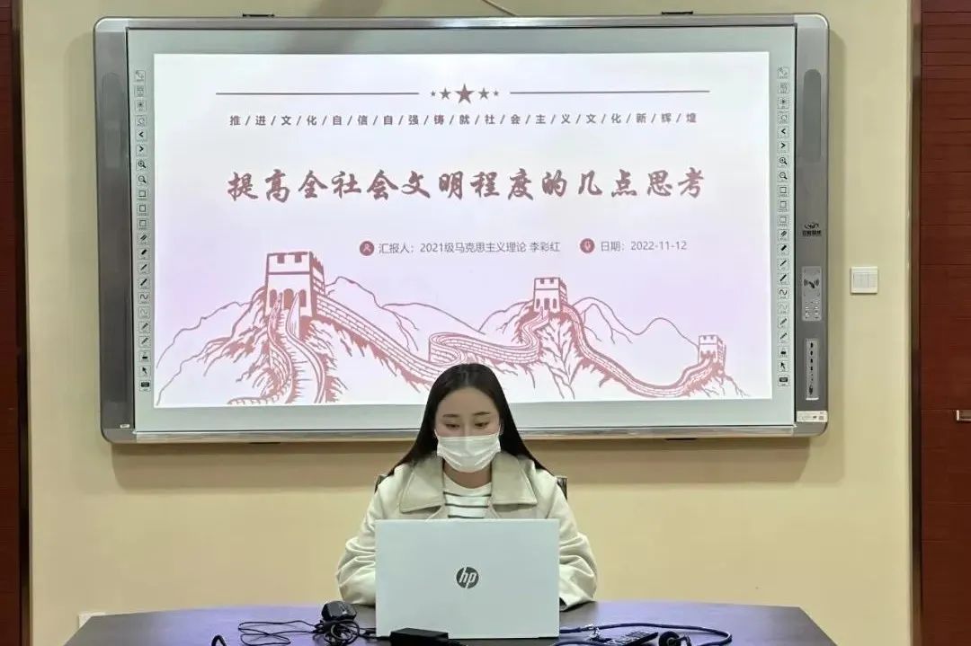 11月12日晚,公司研究生会学习贯彻党的二十大精神系列活动第二期在二办203举行。系列活动第二期以“推进文化自信自强,铸就社会主义文化新辉煌”为主题,共有四位主讲人参与主讲,第二讲主讲人为2021级马克思主义理论专业研究生李彩红。本次活动采用线上线下相结合的方式,全院90余名研究生参加了此次活动。
