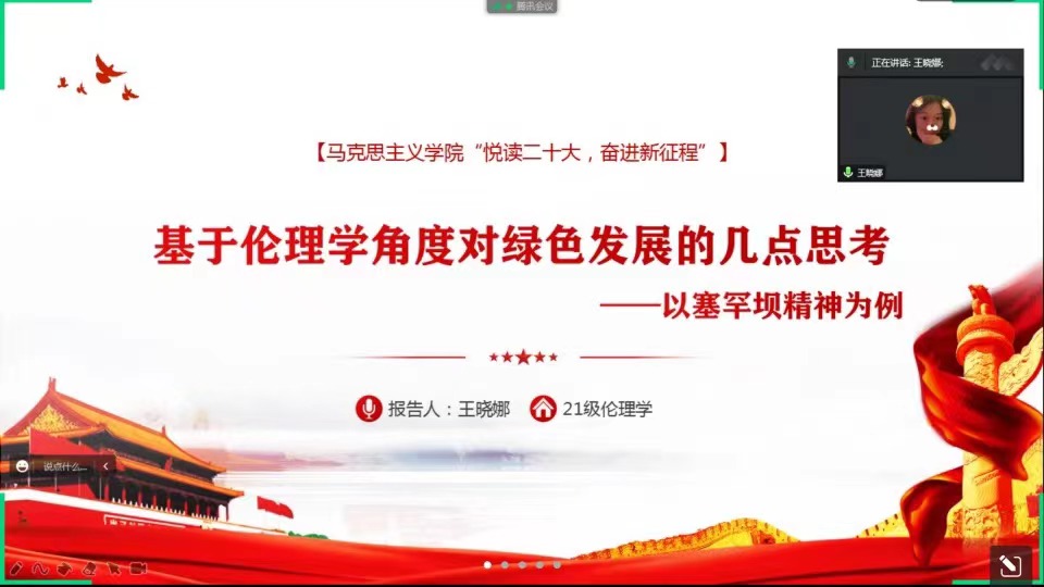 12月4日晚,公司研究生会学习贯彻党的二十大精神系列活动第四期在线上举行。系列活动第四期以“推动绿色发展,建设美丽中国”为主题,共有四位主讲人参与主讲,第一讲主讲人为2021级伦理学专业研究生王晓娜,全院69名研究生参加了此次活动。