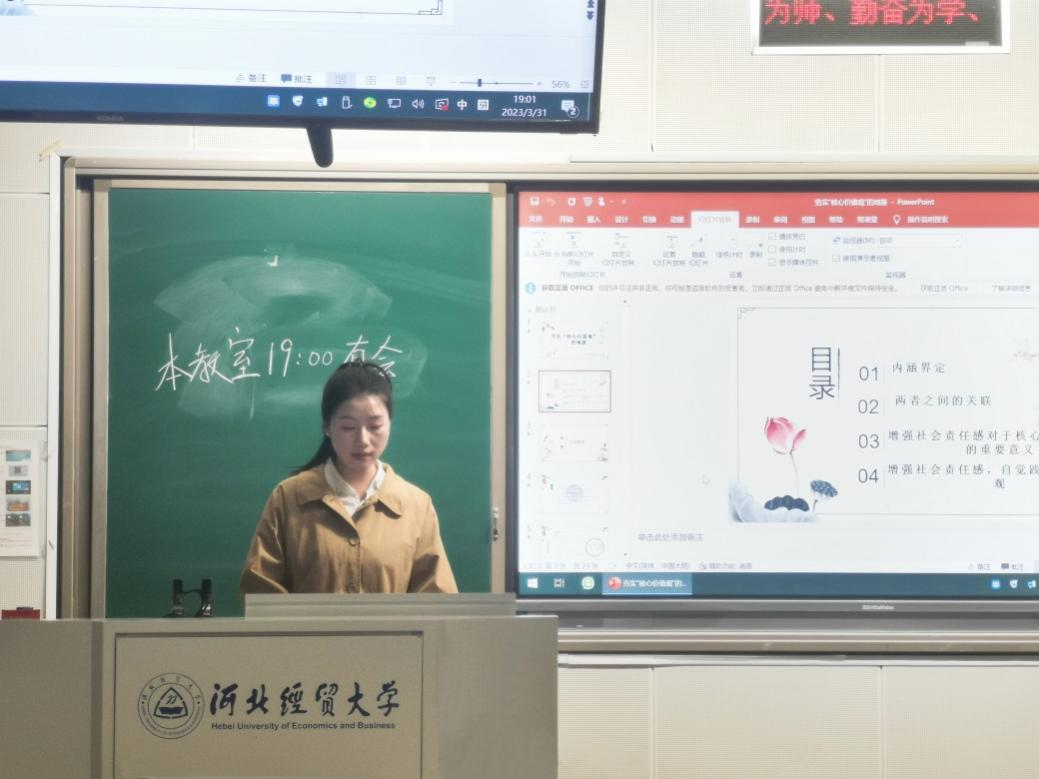 3月31日晚,公司“践行党的二十大,学‘习’讲故事”系列活动第三期在北三教A104举行。系列活动第三期以“社会责任感”为主题,共有四位主讲人参与主讲,第一讲主讲人为2022级马克思主义理论专业研究生崔梦莹,主讲题目为《社会责任感与社会主义核心价值观的践行》。全院59名研究生参加了此次活动。