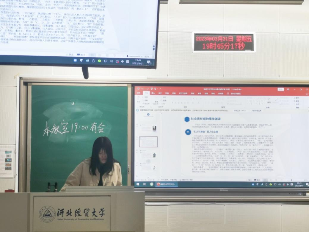 3月31日晚,公司“践行党的二十大,学‘习’讲故事”学习贯彻党的二十大精神系列活动第三期在北三教A104举行。系列活动第三期以“社会责任感”为主题,共有四位主讲人参与主讲,第四讲主讲人为2021级马克思主义理论专业研究生胡欣梦,主讲题目为《新时代老员工社会责任感培育》。全院59名研究生参加了此次活动。