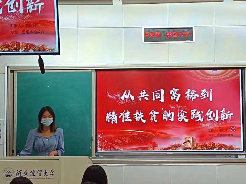裴欣欣同学主讲的题目为《从共同富裕到精准扶贫的实践创新》。她指出,党的二十大报告提出,中国式现代化是全体人民共同富裕的现代化。共同富裕是中国式现代化的重要特征,体现了社会主义最大的优越性,彰显了社会主义的本质。实现共同富裕对建设中国特色社会主义、实现中国式现代化、实现中华民族伟大复兴、夯实党的执政基础都具有重大意义。实现共同富裕的战略目标是一项长期艰巨的历史重任,是全面建成社会主义现代化强国的核心内容。在推动共同富裕的进程中,要遵循规律、稳扎稳打,循序渐进向实现全体人民共同富裕的目标不断迈进。