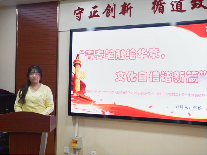 宋莹莹同学以“文化体制机制改革”为主题,领学了牢牢把握深化文化体制机制改革的基本要求。李少龙同学以“文化自信”为主题,领学了坚定文化自信的重大意义、科学内涵和实践要求。唐绍仪同学、张禧同学重点围绕“增强文化自信”等方面,领学了发展社会主义先进文化,弘扬革命文化,传承中华优秀传统文化,对于增强文化自信、激发全民族文化创新创造活力的重要作用。