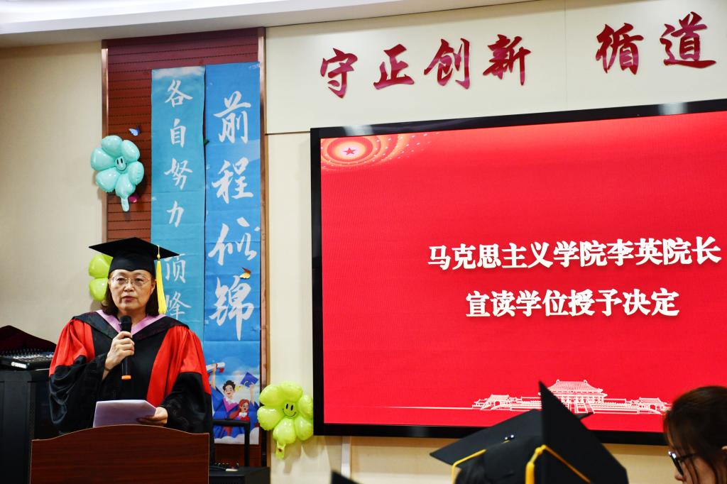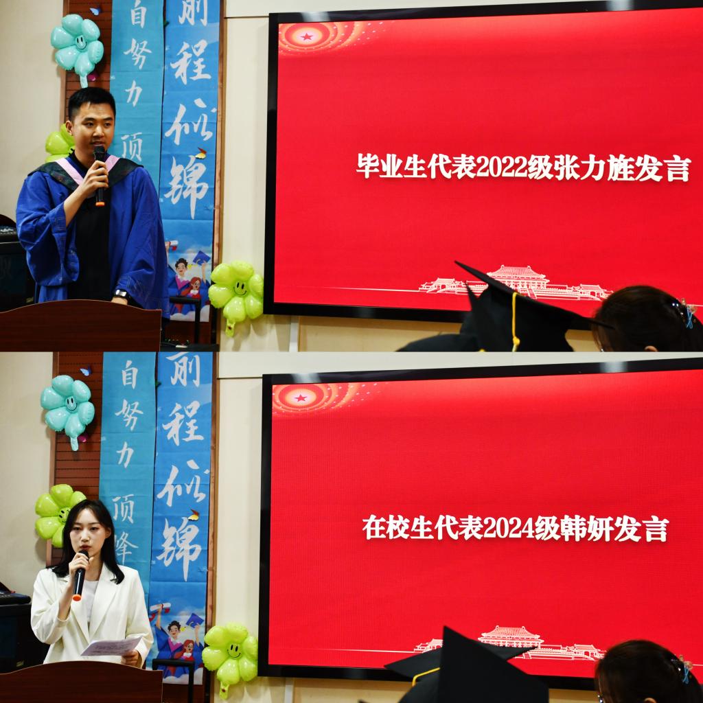 硕士研究生导师代表于清华老师勉励同学们要继续努力、不懈奋斗,祝愿毕业生在未来的学习、工作和生活中前程似锦,蒸蒸日上。毕业班辅导员路艳丽老师感慨与同学们一块学习生活的美好时光,见证了同学们的蜕变成长,希望同学们继续保持昂扬向上的精神状态,富有求新求变的朝气锐气,敢于站在时代前沿,以新的实践创造更大成就,为社会主义现代化强国建设担当作为。