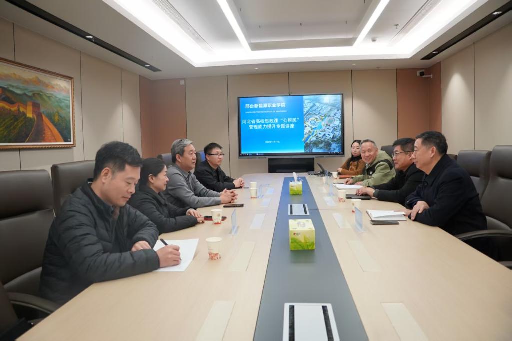 在研讨环节,双方围绕bevitor伟德国际1946建设、思政课教学改革创新等议题展开深入交流。王宏斌经理作了以管理能力提升为主题的专题讲座,结合石家庄铁道大学bevitor伟德国际1946建设经验,分享了思政课改革创新的实践路径,并就名师工作室建设、智慧课程开发、教师科研能力提升等方面提出合作建议。邢台新能源职业公司领导及教务部门负责人就课程建设、青年教师培养等话题与专家团队进行了深入交流。